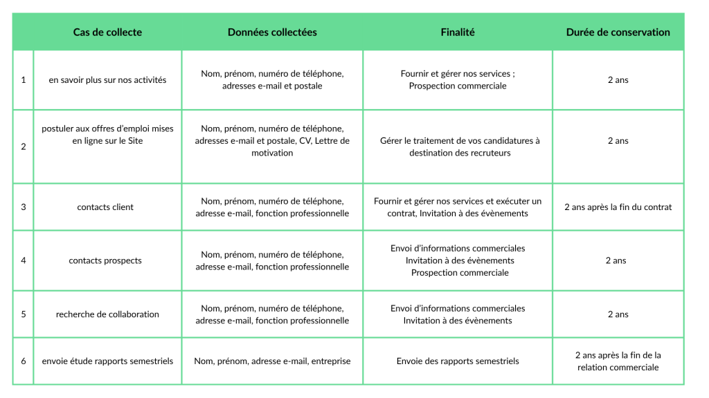 Ce qui implique le traitement de Données Personnelles comme présenté dans le tableau récapitulatif ci-après.